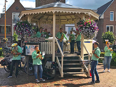 Dit dweilorkest van Muziekvereniging Eensgezind zorgt met haar feestelijke muziek voor een vrolijke noot bij het boodschappen doen.